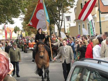 Oberlaaer Erntedankfest, Zugsführer Norbert Treibe, im Hintergrund die Oberlaaer Erntekrone.jpg © Landwirtschaftliches Casino u. Weinbauverein Oberlaa