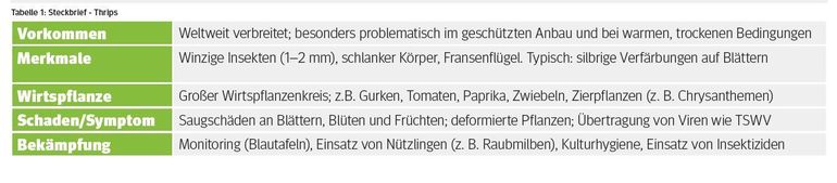 Thrips, auch bekannt als Fransenflügler, gehören zu den häugsten Schädlingen im Garten- und Gemüsebau. Besonders im geschützten Anbau stellen sie durch ihre hohe Vermehrungsrate und vielseitige Wirtspflanzenwahl eine ernsthae Bedrohung dar. Sie schädigen Pflanzen, indem sie ihre stechend-saugenden Mundwerkzeuge in das Pflanzengewebe bohren und Zellinhalte aussaugen, was zu Wachstumsstörungen, silbrig-schimmernden Verfärbungen und Ertragsverlusten führen kann. Einige Arten übertragen zudem gefährliche Pflanzenviren wie das Tomatenbronzefleckenvirus (TSWV). In Mitteleuropa treten ca. 400 verschiedene Thripsarten auf – bedeutend für den Ertragsanbau sind u.a. der Zwiebelthrips und der Kalifornische Blütenthrips.